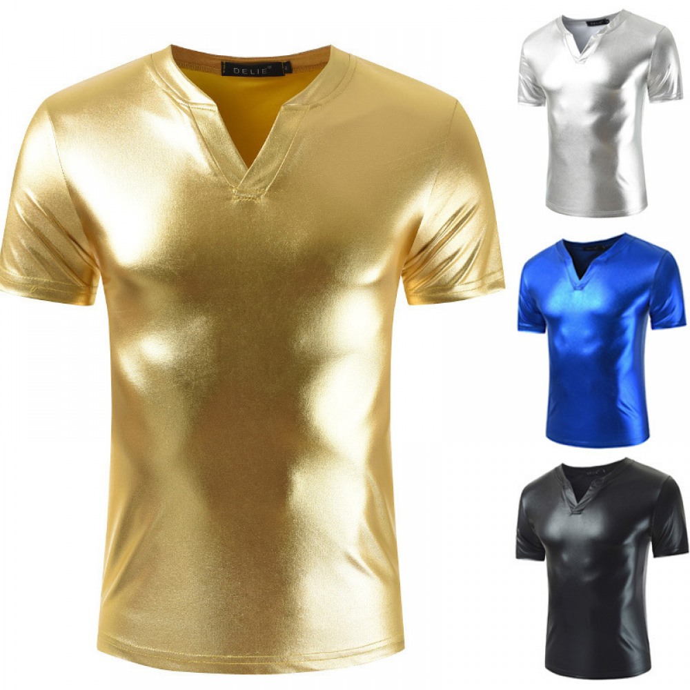 Men's T-Shirt V-Neck Solid Color Shiny Nightclub Design Dynamic Fashion Sexy Mens Short Sleeve T-Shirt
